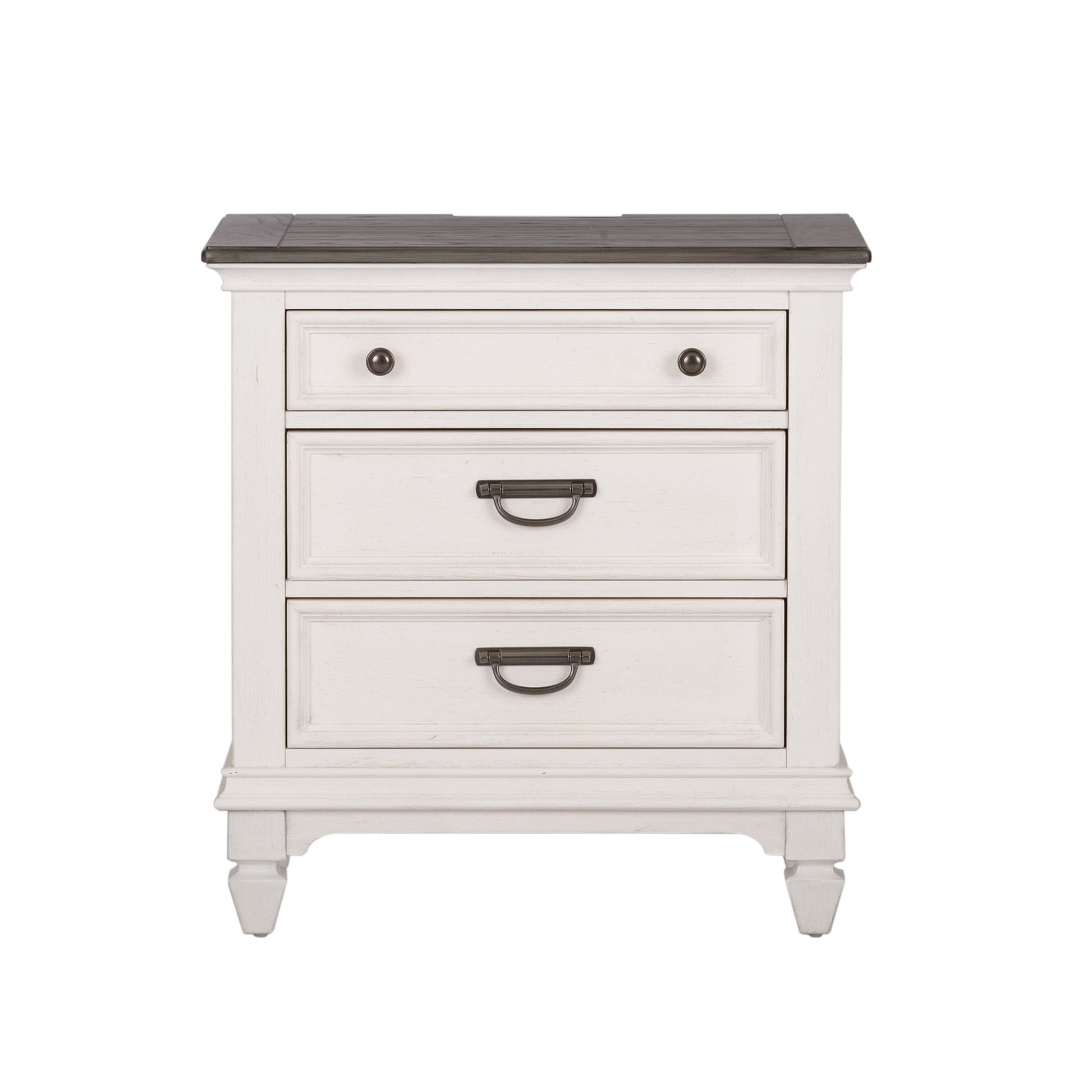 Create a classic look with a casual feel using this 3 drawer night stand. The two-toned wire brushed finish. Planked tops add a vintage vibe while the stylish tapered feet tie in to the cottage design. With today's technology in mind, users can enjoy the benefit of the incorporated charging station, featuring two USB ports and two outlets, making multi-device charging a breeze.