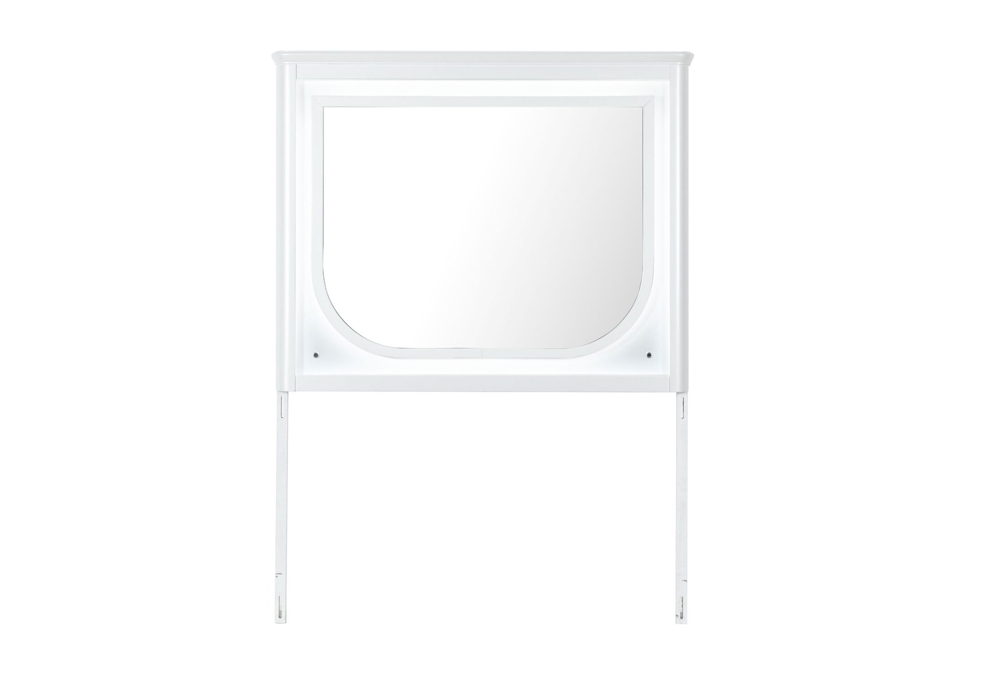 Enhance your room with the Apollo Mirror, featuring LED accent lighting for a modern touch. Its sleek design and light grey finish perfectly complete the Apollo Bedroom Collection.