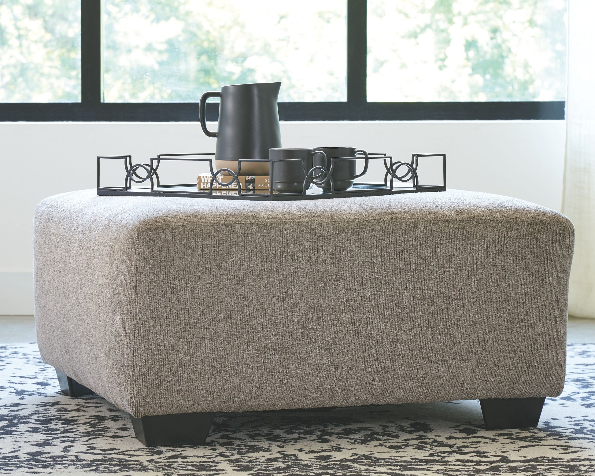 Celebrate strength and durability in design with this oversized accent ottoman. Neutral color opens doors for you to use your imagination with accessorizing the room. Softly textured chenille cushion sports stylish versatility. Throw up your feet or use it as a table for a show-stopping tray. It's all up to you.