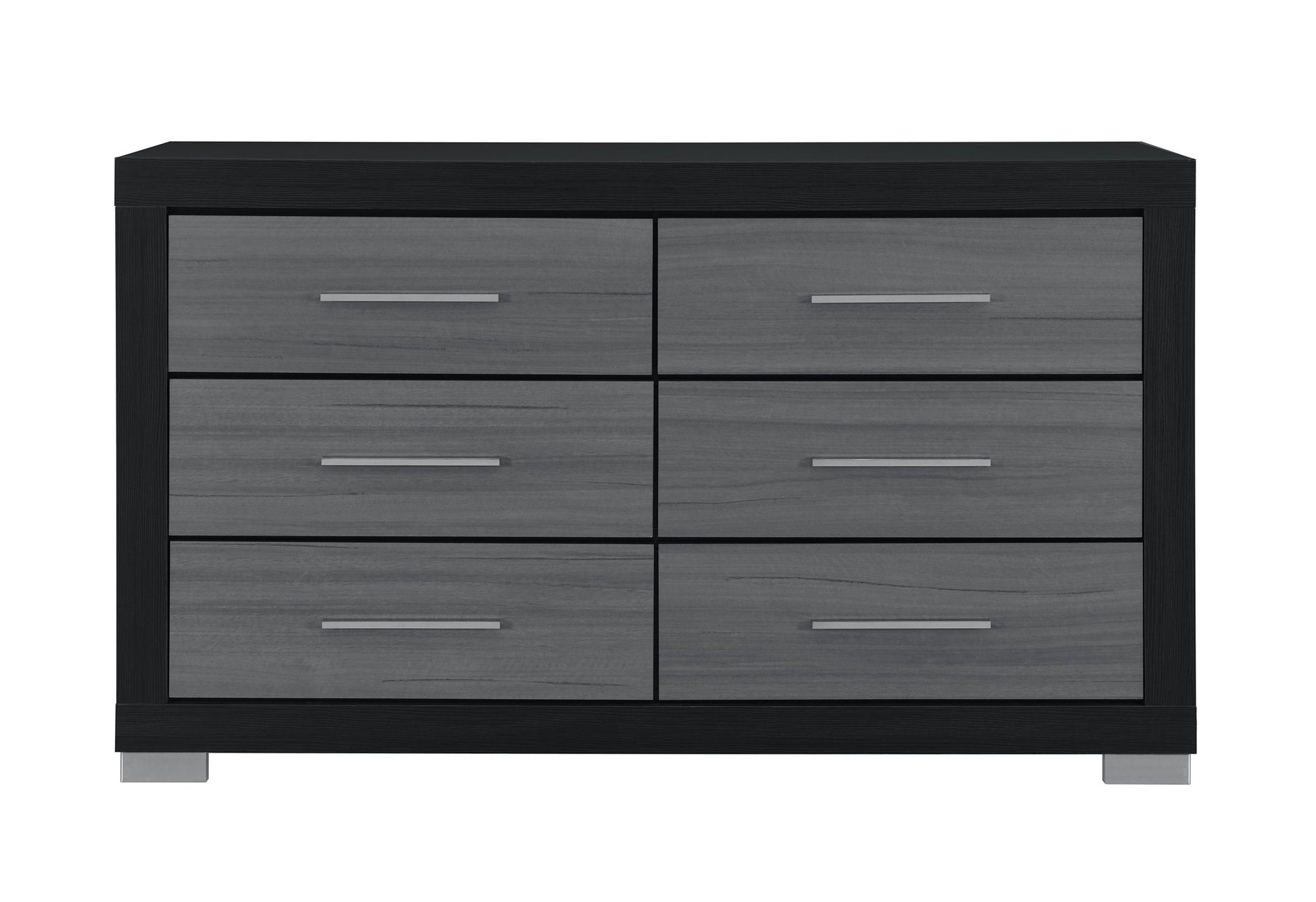 The Emma Dresser adds a touch of sophistication to your bedroom with its sleek two-tone black and grey finish. This dresser features multiple spacious drawers, ideal for storing clothing, accessories, and more. With its clean lines and modern design, it offers both style and functionality, perfectly pairing with other pieces of both the Emma or Madison collections.