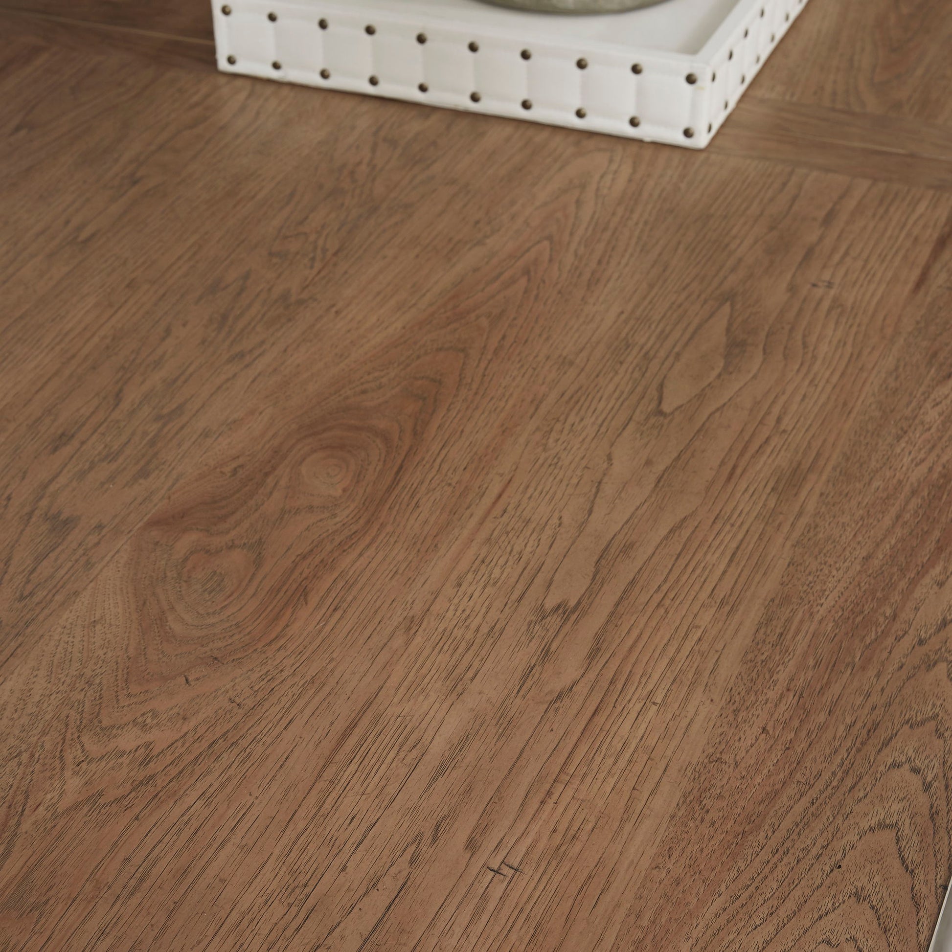 Wow family and friends with the Farmhouse Reimagined five-piece pedestal table set. Crafted of pine and poplar solids with hickory and pine veneers, this set features an antique finish with heavy wire brush distressing and a chestnut top and consists of the pedestal table and four splat back side chairs. The pedestal table features a 12” removable leaf that is anchored by architectural curved legs to form a pedestal that flows into bracket feet. The splat back side chairs offer beautiful detail on the back and has a padded upholstered seat in a khaki linen fabric with tapered legs and nylon chair glides to protect your flooring. Farmhouse Reimagined offers looks that easily work in today’s homes with style uncompromised and comfort abound.