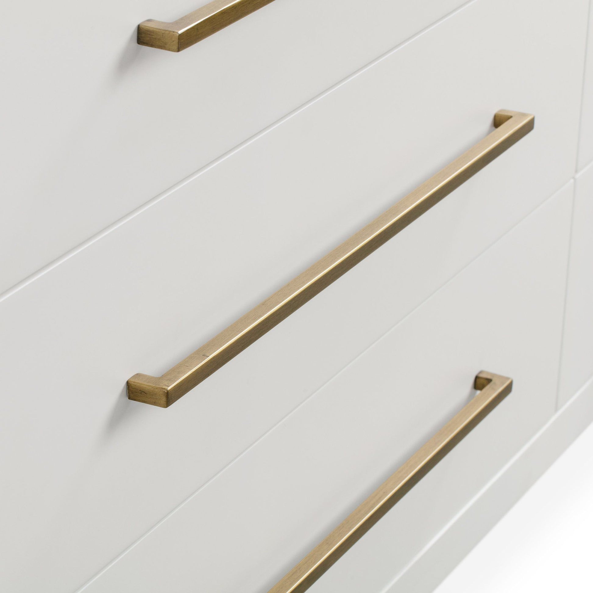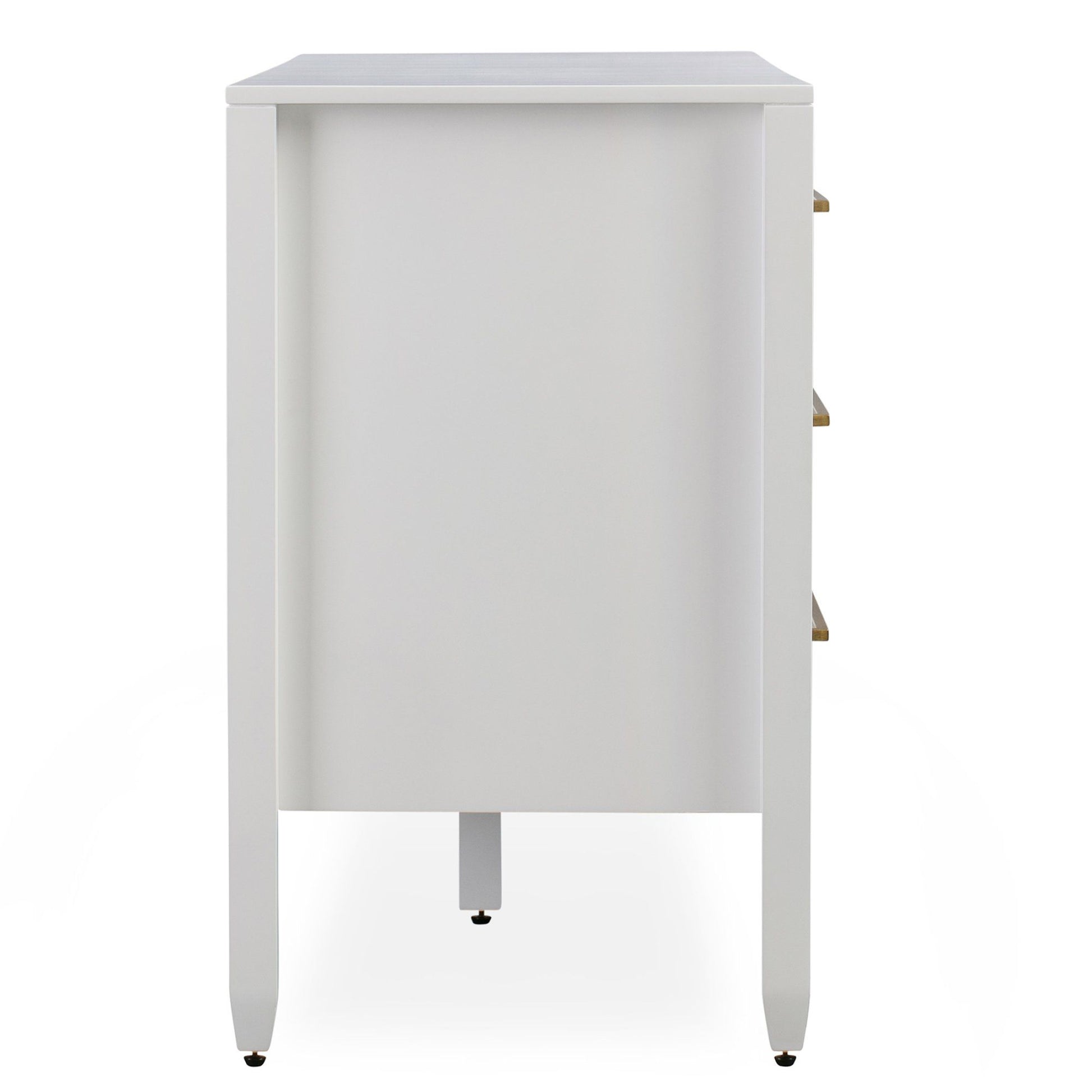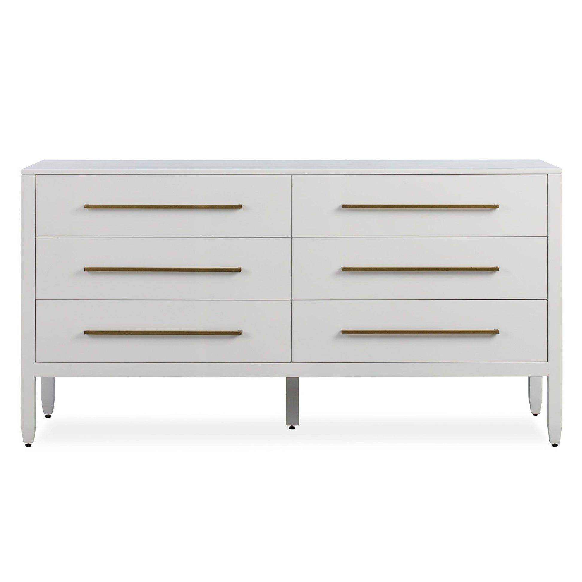 A six-drawer wood chest with metal glides and tapered legs inspired by mid-century modern.