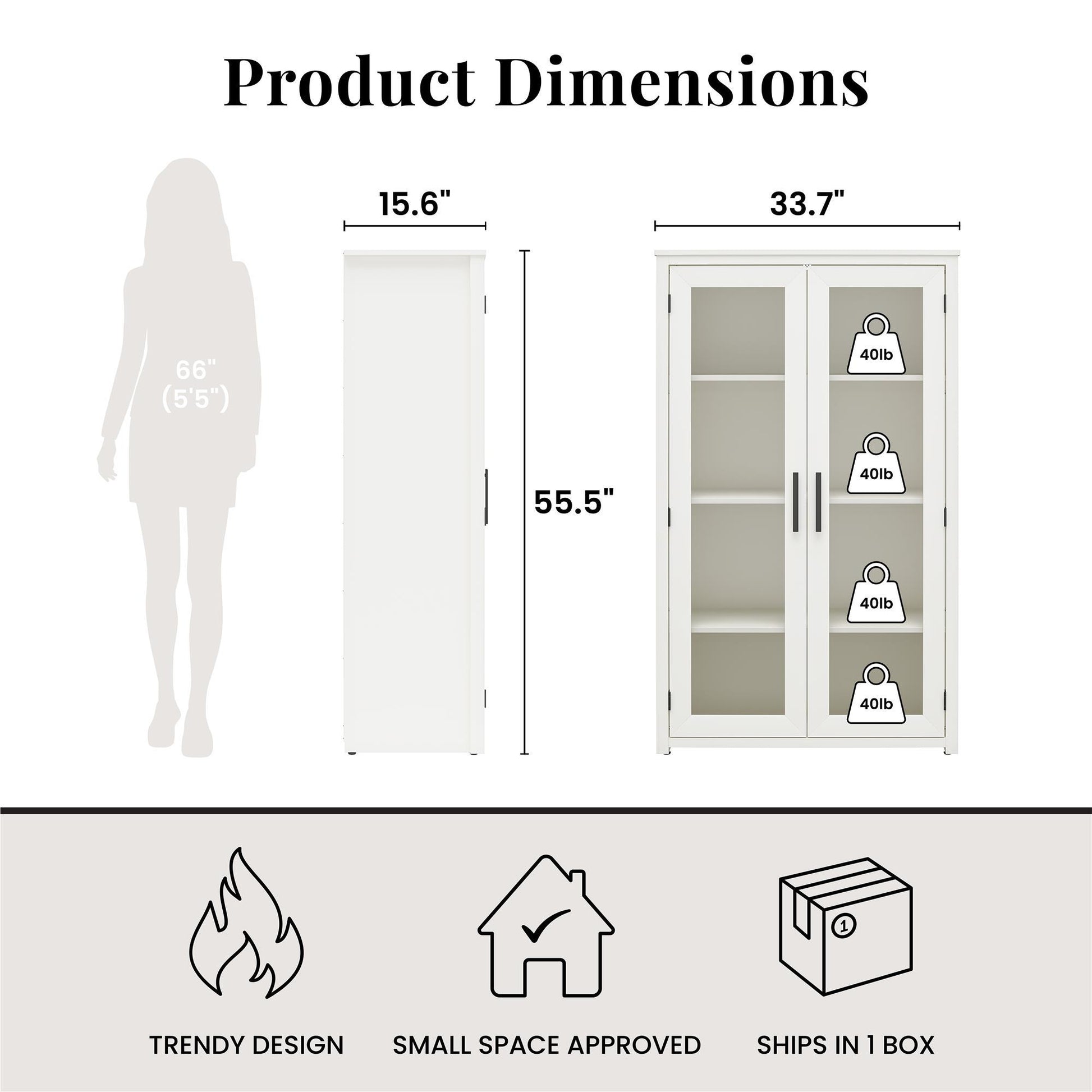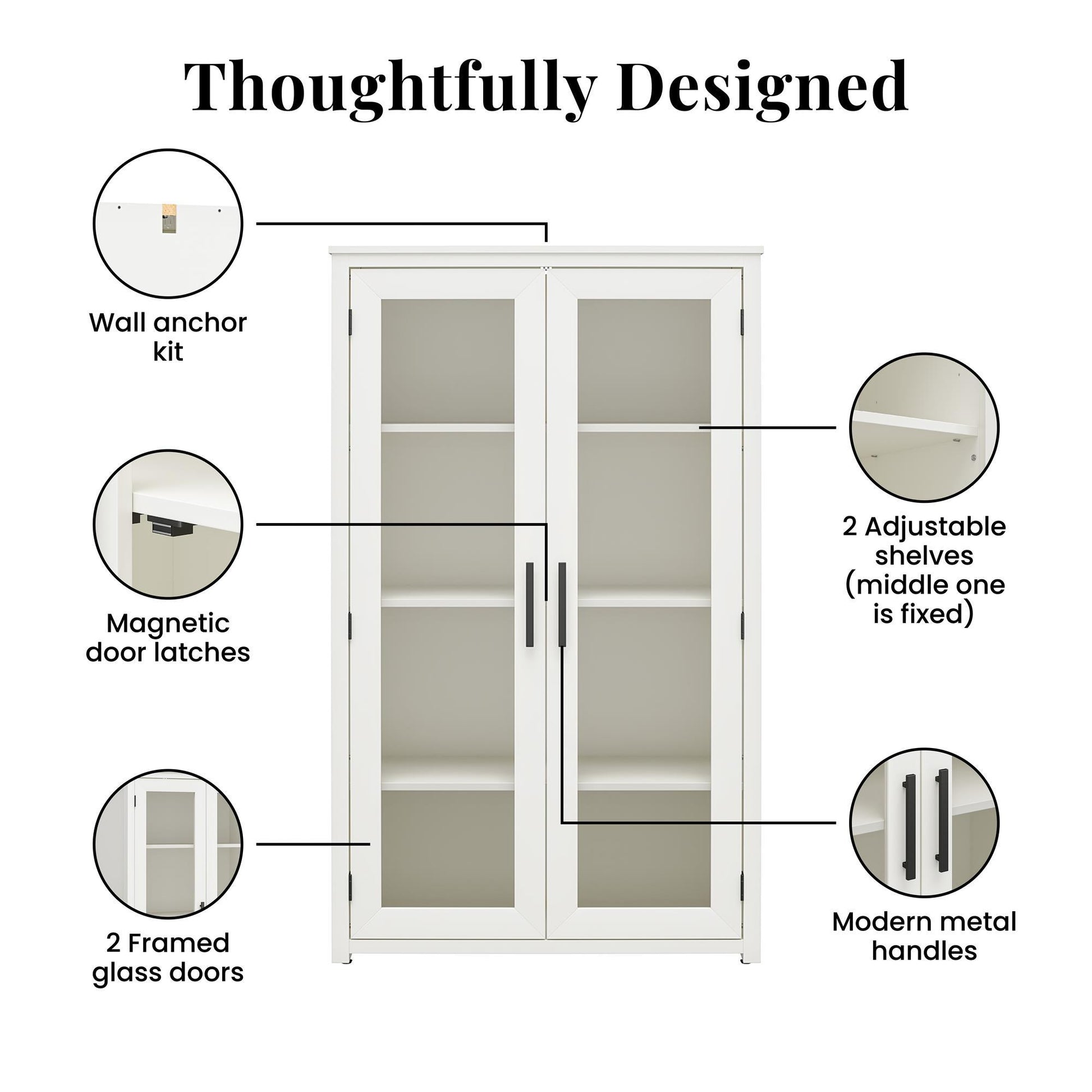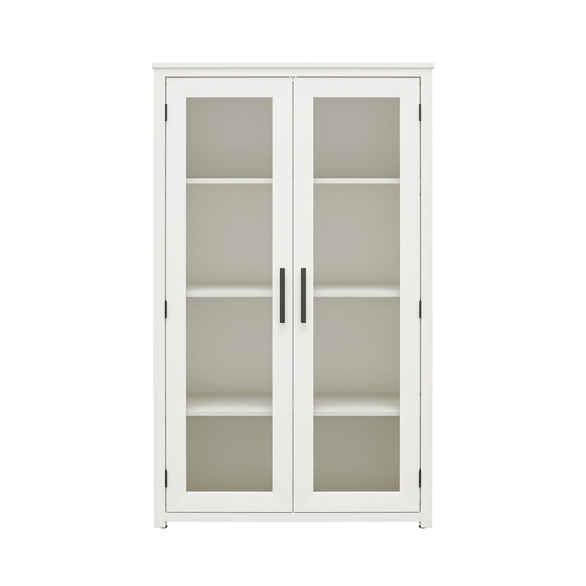 - Four Interior Shelves: Spacious storage behind glass doors; two adjustable shelves accommodate varying item heights