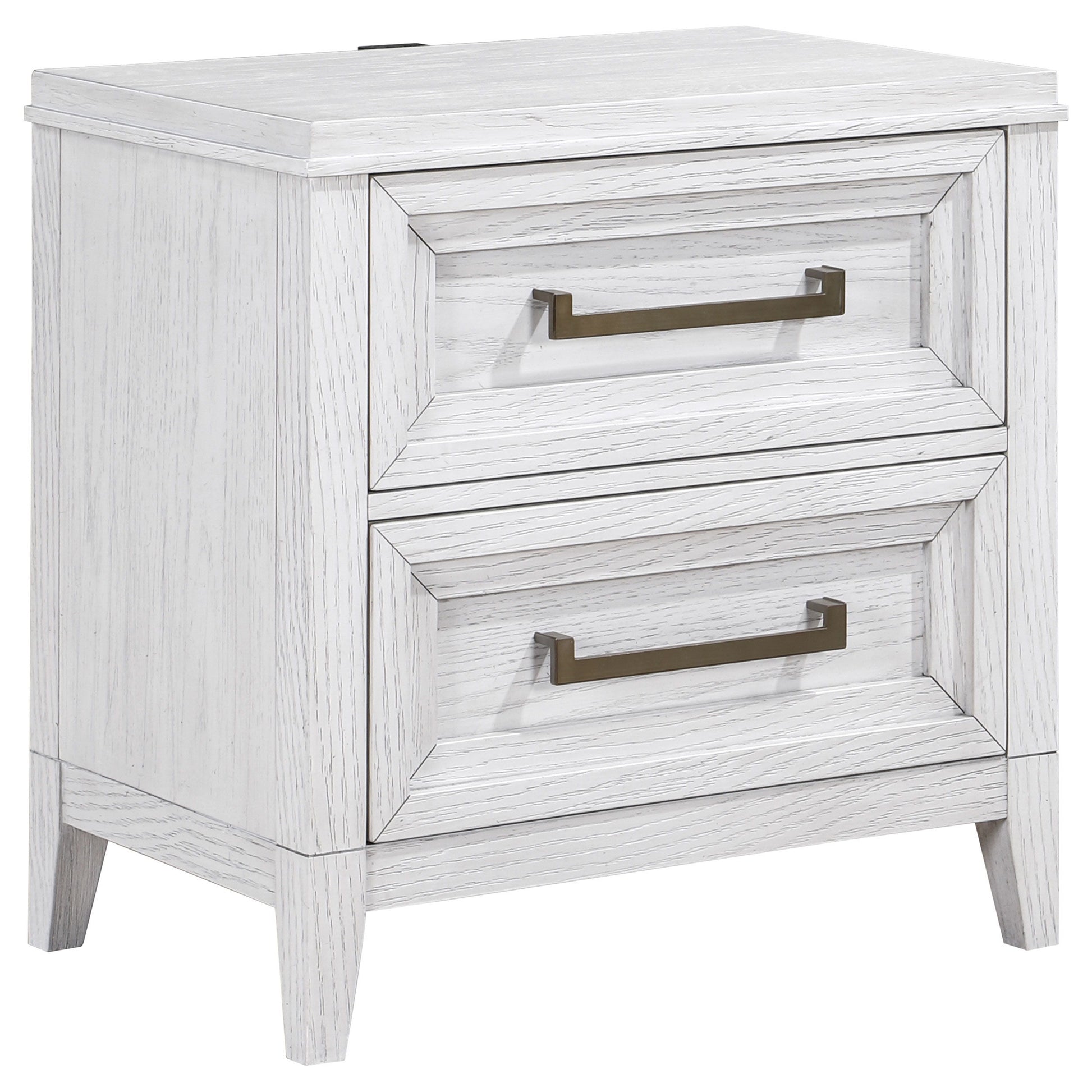 Bring fresh perspective to your bedside with a modern two-drawer nightstand. Its casual style and classic stance create a restrained look and feel, perfect for a soothing bedroom space. It features a distressed white finish over wood grain, creating subtle depth and detail. Drawers are roomy for bedside essentials, and stepped fronts add character and dimensionality. Contrasting antique brass toned bar pull complete the look, offering stylish allure in your stylish bedroom.