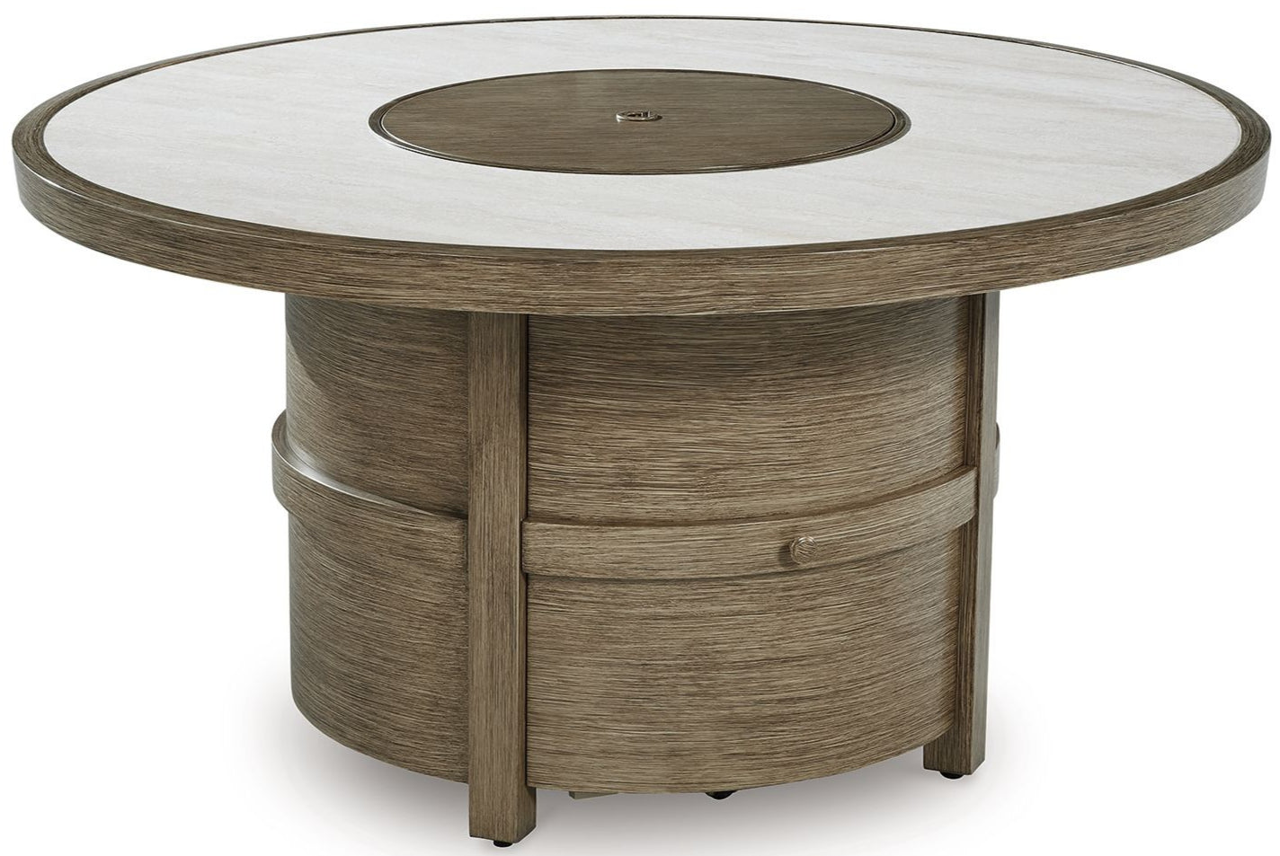 Experience the perfect combination of durability and style with this outdoor fire pit table. An aluminum frame with a wood-look finish maintains a sleek, contemporary aesthetic, while the sintered stone tabletop adds an element of natural elegance. A stainless steel burner with glass beads adds a captivating element sure to wow. This delightful addition to your outdoor dining creates an oasis where comfort and beauty thrive.