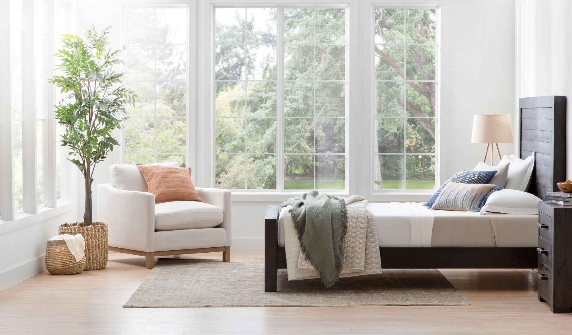 A striking focal point in the bedroom thanks to dark-stained wood and a tall, dramatic headboard.