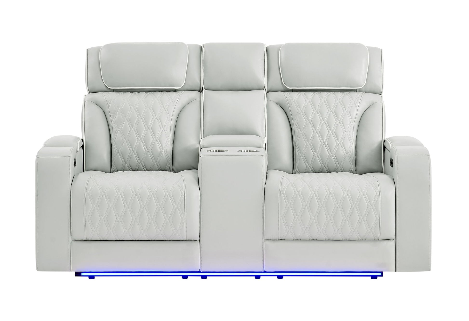The U8611 Power Console Reclining Loveseat combines modern comfort with smart functionality. Finished in neutral blanche silver with elegant diamond stitching, it features dual power reclining and power headrests for customized relaxation. A center console with storage and cupholders keeps essentials close at hand, while a built-in speaker system enhances entertainment. Hidden arm storage, LED-lit side pockets, and LED base lighting complete this loveseats sophisticated, high-tech design.