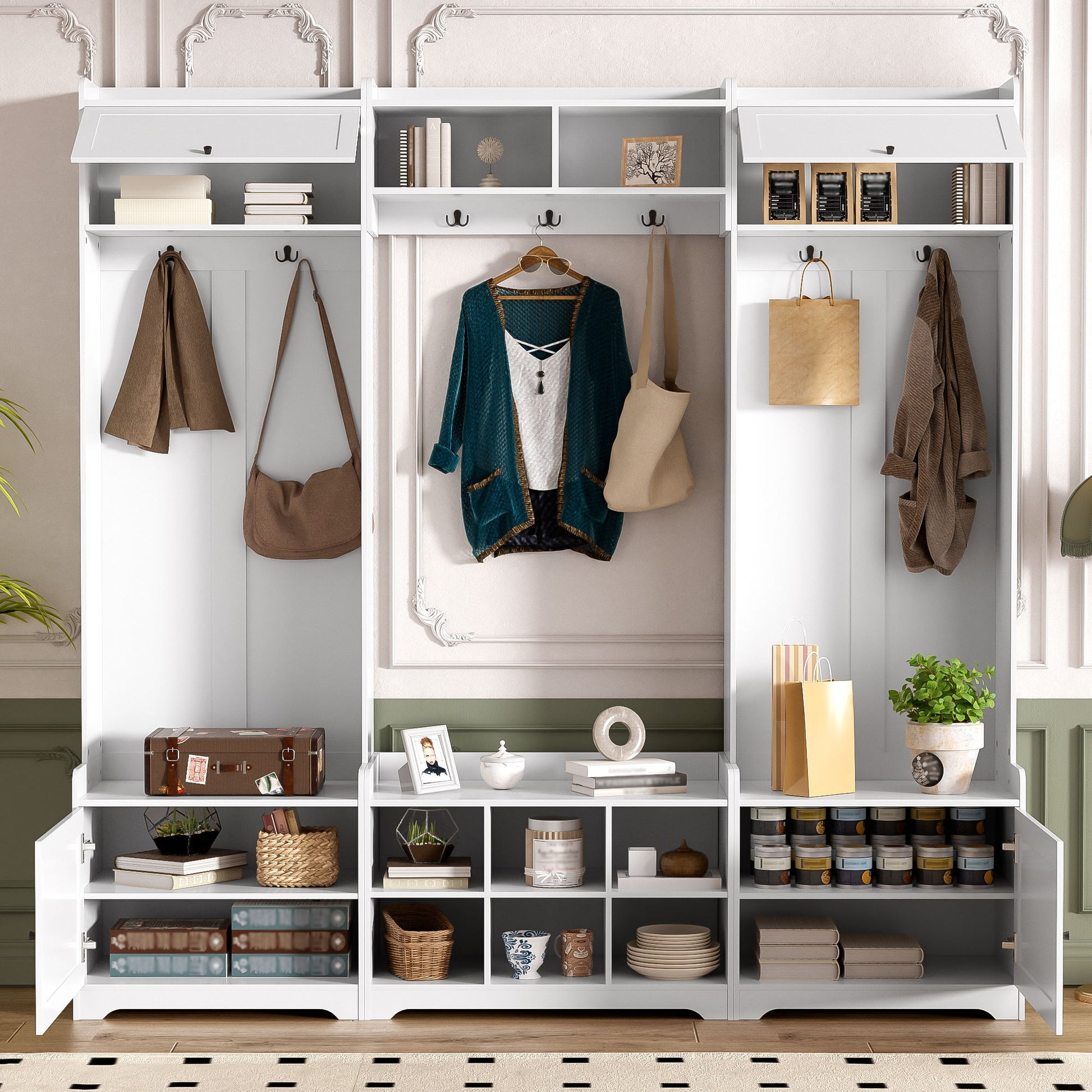 Wide Hall Tree With Shoe Storage, 4 In 1 Entryway Bench With 8 Cubbies, 7 Coat Hooks & Adjustable Shelf For Hallway - White